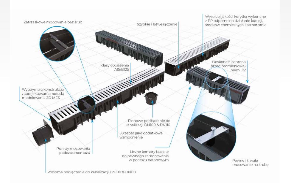 Oferowane odwodnienia liniowe charakteryzują się wysoką wytrzymałością, estetycznym wyglądem oraz odpornością na czynniki atmosferyczne.